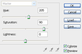 Pritisnite tipki CTRL + U in označite Colorize. Potem pa se poigrajte z drsniki toliko časa, dokler vam polnilo ne bo všeč. Jaz sem nastavil Hue 205, Saturation 90 in Lightness 0. Kliknite na gumb OK. |