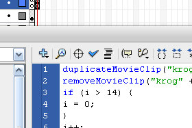duplicateMovieClip("krog", "krog" + i, i); removeMovieClip("krog" + (i-15)); if (i > 14) { i = 0; } i++; Potem lahko zaprete okno Actions. |