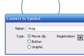 V polje Name vpišite krog in označite Movie clip. Kliknite na gumb OK. |