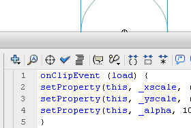 onClipEvent (load) { setProperty(this, _xscale, (300 - _root._xmouse) * 2); setProperty(this, _yscale, (300 - _root._ymouse) * 2); setProperty(this, _alpha, 100); } onClipEvent (enterFrame) { setProperty(this, _xscale, _xscale - 10); setProperty(this, _yscale, _yscale - 10); if (_alpha > 4) { setProperty(this, _alpha, _alpha - 5); } } Potem lahko zaprete okno Actions. |