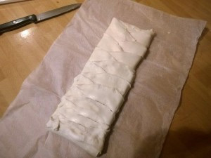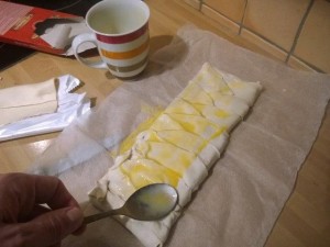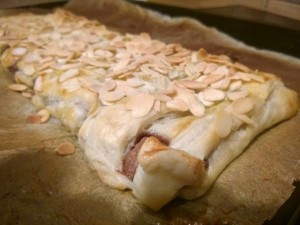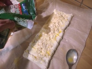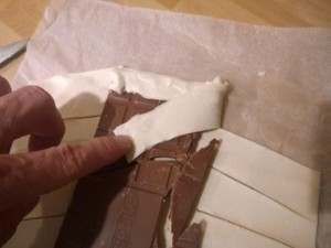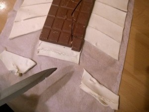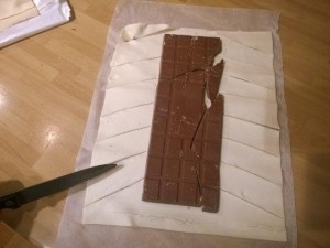 Razpotegnite listnato testo, ki ste ga kupili v trgovini. Potem pa nanj postavite večjo čokolado. Jaz sem uporabil Gorenjka čokolado s celimi mandlji. Nato pa listnato testo narežite na poševne črte kot sem to storil sam (glej sliko). |