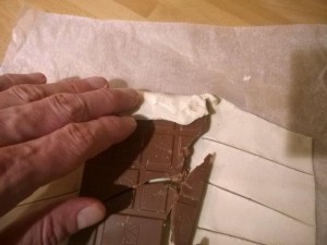 Prav tako to storite zgoraj. Potem pa zgornji del prepognite čez vrhnji del čokolade (glej sliko). |