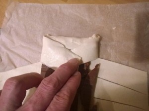 Nato pa primite en prej poševno narezan del listnatega testa in ga prepognite čez čokolado (glej sliko). |