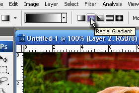 V zgornji opravilni vrstici določite Radial Gradient (glej sliko). Preliv mora biti iz bele v črno barvo. |