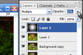 Znižajte mu opacity na okoli 25% (glej sliko).