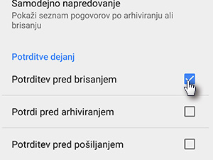 ![]() V novem oknu spodaj označite Potrditev pred brisanjem in se postavite na začetni zaslon. Tukaj lahko potrditve nastavite tudi za arhiviranje in pošiljanje. |
