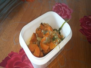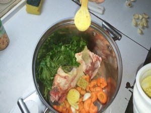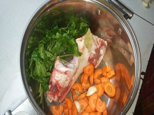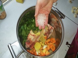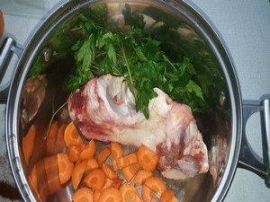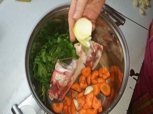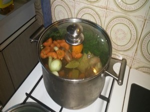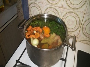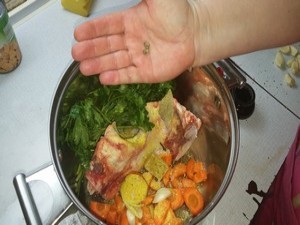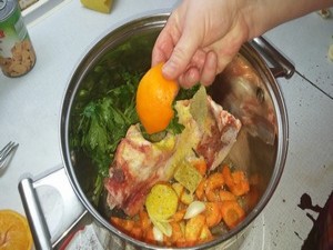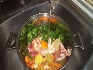 Korenček, čebulo, česen in petršilj lahko ponudimo zraven juhe ali pa uporabimo za kakšno omako. Poper, lupino pomaranče, lovorjev list, klinčke in olupek čebule zavržemo. |