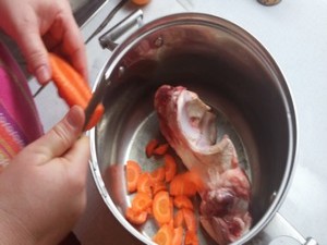 Narežemo večji korenček na kolobarje in ga dodamo v lonec. |