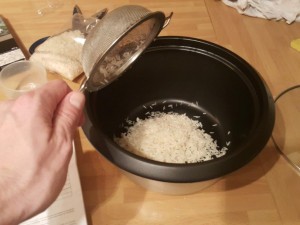 Nato pa opran riž stresite v posebno posodo za kuhanje. Če kuhalnik uporabljate prvič, posodo in vse skupaj dobro prej umijte ter posušite. |