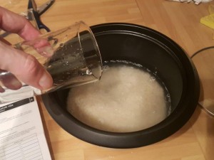 Dodajte nato dva kozarca vode. Torej en kozarec riža, dva kozarca vode in tako naprej. |