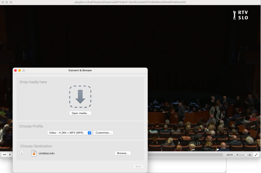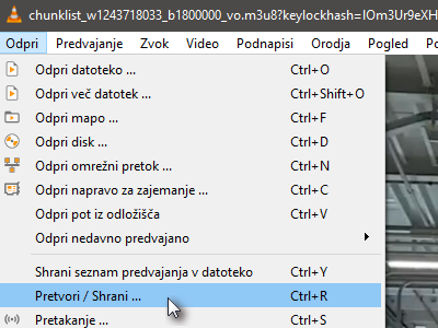 ![]() Ko imate enkrat to povezavo shranjeno, jo lahko predvajate v programu VLC in sicer tako, da izberete možnost Odpri mrežni pretok ... Če pa želite video shraniti na svoj disk, pa izberite možnost Pretvori / Shrani ..