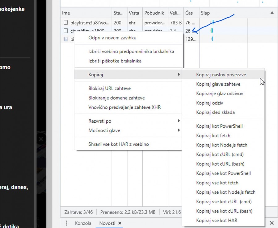 Naredi, kot je po lekciji, do 5. koraka. Video naj bo ustavljen. Nato pa daš predvajati video in v Chrome inspectorju enostavno pogledaš, katera je povezava do videa. Ta ima končnico .m3u8 Nato lahko to povezavo odpreš v VLC. |