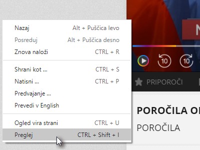 ![]() V nadaljevanju bo prikazan postopek v brskalniku Chrome, na ostalih brskalnikih pa je zadeva dokaj podobna. Kliknite z desnim miškinim gumbom kjerkoli na strani razen direktno na videu in v meniju izberite možnost Preglej. |