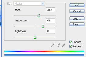 Pritisnite tipki CTRL + U, da odprete okno za urejanje barv. Označite Colorize in se poigrajte z drsniki. Jaz sem določil Hue 213, Saturation 69 in Lightness 0. Kliknite na gumb OK. |