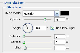 Odpre se novo okno. Blend Mode nastavite Multiply in črno barvo. Distance nastavite 0 px, Spread 0 % in Size 5 px. Ne zaprite še okna... |
