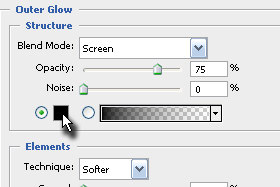 Blend Mode nastavite Screen, Opacity 75 % in Noise 0 %. Določite preko kvadratka črno barvo (glej sliko). Ne zaprite še okna... |