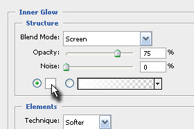 Blend Mode nastavite Screen, Opacity 75 % in Noise 0 %. Določite preko kvadratka belo barvo (glej sliko). Ne zaprite še okna... |