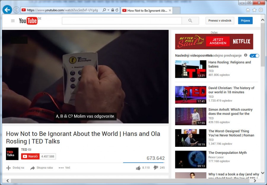 ![]() V YouTube odprite nek poljuben posnetek. Jaz sem odprl ikono TEDx, Hans Roslinga. Kliknite tukaj, da odprete video posnetek.