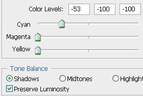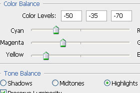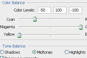 Odpre se novo okno. Tone Balance značite Midtones. Potem pa določite Color Levels na -50, 100 in -100. |
