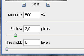 Odpre se novo okno. Amount določite 500 %, Radius 2,0 pixels in Threshold 0 levels. Kliknite na gumb OK. |