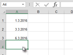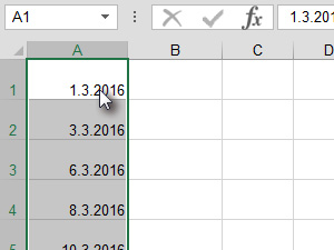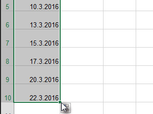 ![]() ... in povlecite navzdol, da začnete z ponavljanjem. Excel bo avtomatično uporabil vse tri prej vnesene datume. |