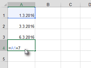 ![]() Vpišite =A1+7. A1 je celica, kjer je vpisan prvi datum, 7 pa predstavlja dodaj sedem, kar predstavlja en teden. |