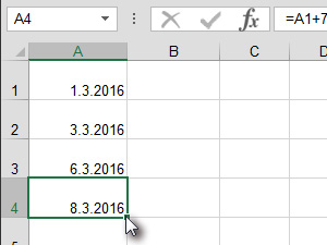 ![]() Ko boste formulo potrdili, se vam bo ustvarila celica z datumom, ki je za sedem dni natavljena v naprej. Potem pa to celico primite za spodnji desni del (glej sliko) ... |