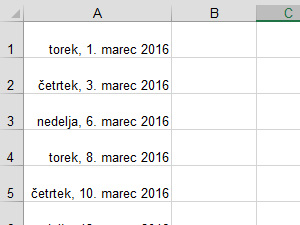 ![]() V razpredelnico vpišite tri različne datume, katere želite ponavljati. Jaz bi rad ponavljal torek, četrtek in nedeljo. Nato pa označite celico pod njimi, kjer boste začeli ponavljati.