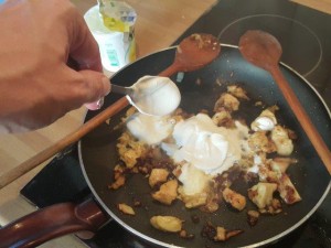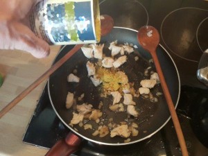 Potem pa dodajte pripravljenega piščanca ter redno mešajte. |