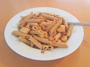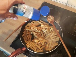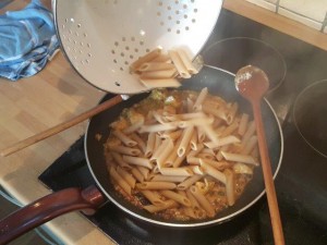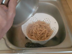 Dodajte prej skuhane polnozrnate testenine in dobro premešajte jed. |