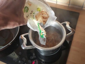 Kuhajte jih toliko časa, kolikor je prizkazano na embalaži testenin, potem pa jih odcedite. V mojem primeru je bilo to deset minut. V tem času sem pripravil piščanca. |