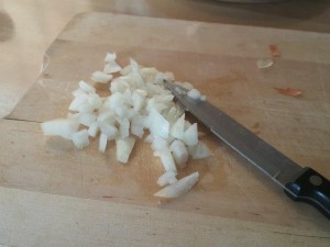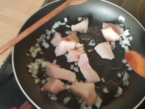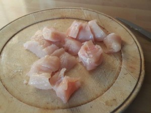 Pripravite piščančja prsa in jih narežite na majhne koščke. |