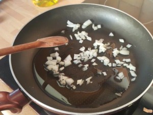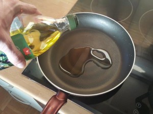 Pripravite ponev in jo postavite na kuhalno ploščo z nastavljeno srednjo temperaturo ter dolijte malo olivnega olja. |