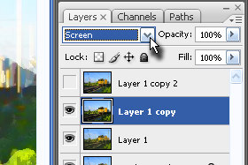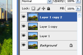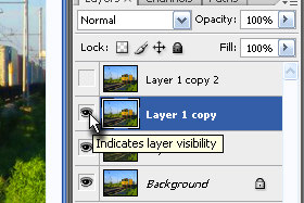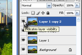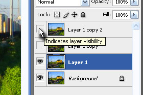 Kliknite na oko, ki se nahaja poleg preodgledne sličice (glej sliko). Potem pa označite prvi duplicirani layer (glej sliko). |