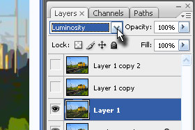 Sedaj layerju določite še senčenje na Luminosity (glej sliko).