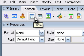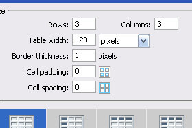 Določite Rows 3, Columns 3, Table Width 120 pixels in Border thickness 1 pixels. Določili smo tabelo z 9 celicami v treh vrstah. Širina celotne tabele je 120 in rob 1 piko. Kliknite na gumb OK. |