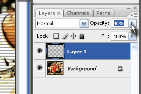 V paleti layerjev določite layerju z vzorcem Opacity na okoli 40% (glej sliko).