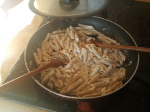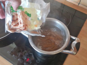 V lonec z vodo dodajte toliko testenin, kolikor jih boste pojedli. Jaz sem uporabil polnozrnate, saj so mi po okusu boljše. Lonec nato postavite na kuhalno ploščo z nastavljeno najvišjo temperaturo. Med tem, ko se bodo testenine kuhale, lahko naredite tudi lososovo omako (glej korak 3). |