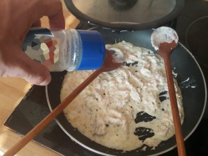 Vse skupaj dobro premešajte, da se kisla smetana stopi in nato malo posolite. |