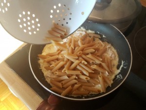 Dodajte prej kuhane testenine in dobro premešajte. |
