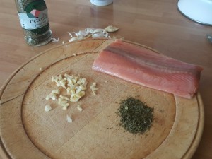 Nasesekljajte česen in peteršilj ter pripravite zrezek lososa. |