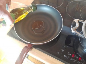 Postavite ponev na kuhalno ploščo z nastavljeno srednjo temperaturo ter dolijte malo olivnega olja. |