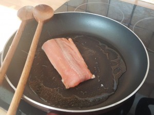 Ko se bo olje segrelo, postavite nanj zrezek lososa. |