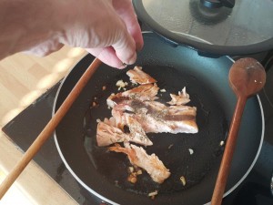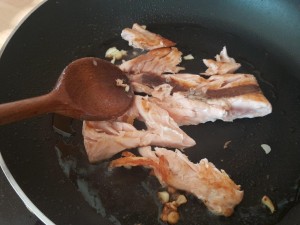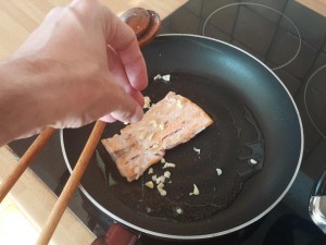 Zrezek lososa vsake toliko časa obrnite, saj se hitro speče. Med peko dodajte česen. |