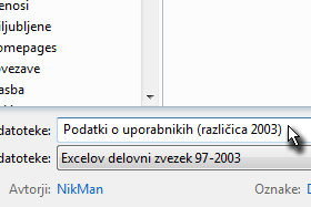 V polje Ime datoteke vpišite poljubno ime in spodaj Vrsta datoteke pustite Excelov delovni zvezek 97-2003. Kliknite na gumb Shrani. |