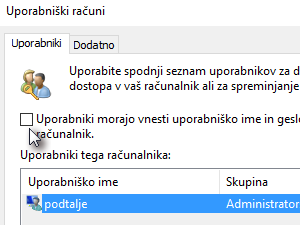 ![]() Odstranite kljukico pri polju Uporabniki morajo vnesti uporabniško ime in geslo, če želijo uporabljati ta računalnik. |