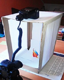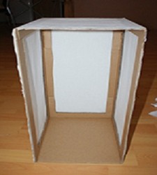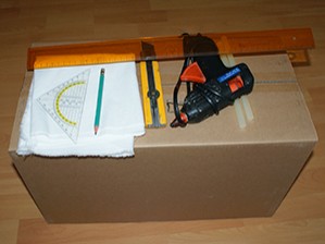 ![]() - škatlo iz kartona (dovolj veliko, da bomo vanjo spravili objekt, ki ga bomo fotografirali) - belo blago (ali bel papir za zavijanje) - olfa nož - škarje - svinčnik - pištolo na vročo plastiko (ali lepilo) - daljše ravnilo in geotrikotnik