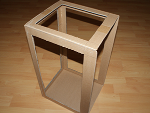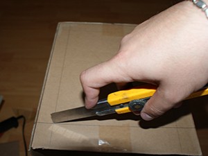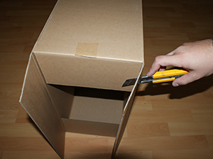 ![]() Vzamemo olfa nož in odrežemo sprednje štiri stranice na škatli, ki služijo za zapiranje le-te. S te strani bomo kasneje postavili fotoaparat. |