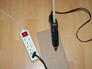 ![]() Pištolo na vročo plastiko priklopimo na elektriko, da se nam segreje. Potrebovali jo bomo, da oblepimo stranice škatle. Če boste uporabli lepilo, seveda preskočite ta korak.