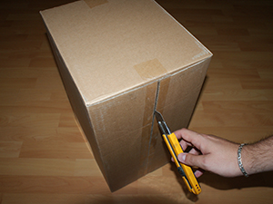 ![]() Prerežemo lepilni trak, ki drži škatlo zlepljeno na zadnji strani in škatlo popolnoma razpremo. Če je škatla zadaj zlepljena z lepilom z notranje strani, praskočimo tega in naslednja dva koraka.